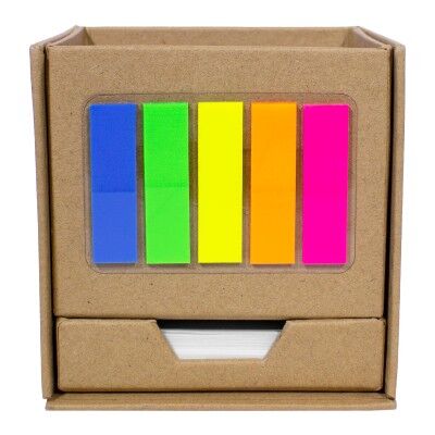 10 x 10 x 10 cm. Cartón. Porta Lápiz con post-it de tiras de diferentes colores flúo en el frente. Empujando hacia adelante, encuentras bloc rectangular con autoadhesivos de color amarillo y en la parte inferior un contenedor con hojas blancas de 7,4 x 8,7 cm. Producto Reciclable.