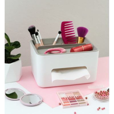 Porta pañuelos desechables con porta celular y compartimentos para almacenaje, fabricado en plástico PP. Es ideal para almacenar varios artículos de papelería o personales. La solución perfecta para organizar y llevar tus artículos de papelería o personales de manera ordenada y conveniente. Medidas: 21x16 cm.