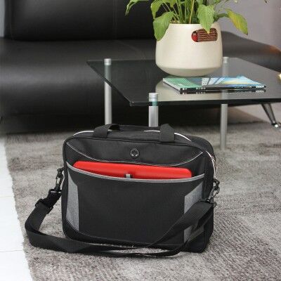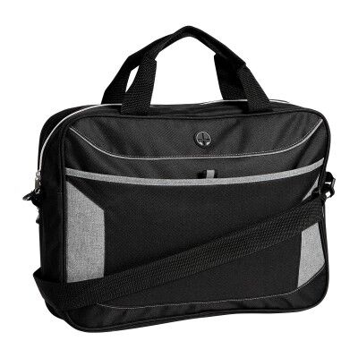 Portafolio ejecutivo fabricado en poliéster con salida para audífonos, bolsa al frente y correa de hombro. Medidas: 32x40 cm.