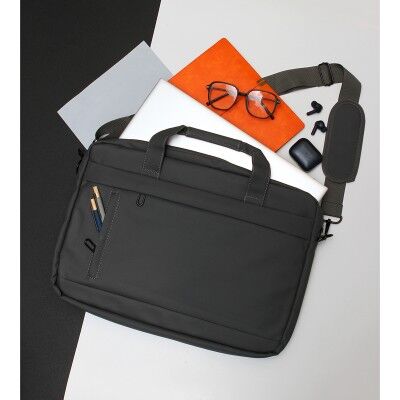 Portafolio para laptop fabricada en curpiel, con compartimento principal y compartimento secundario para documentos. Cuenta con asas y correa para transportar cómodamente. Medidas: 32x44x6 cm.