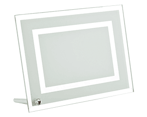Portaretrato de vidrio con diseño biselado para sublimar. La imagen queda adherida al vidrio por la parte superior.