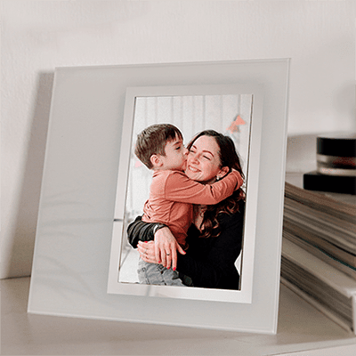 Portarretratos de cristal con soporte plegable. Medidas de espacio para fotografía: 9.7 x 14.4 cm. Medidas: 19 alto x 19 ancho