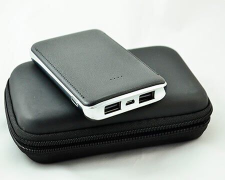 powerbank forrada en piel color negra con capacidad de 6,000 mah