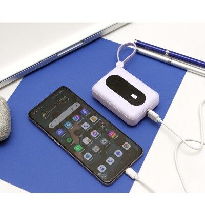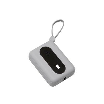 Power bank con cable y correa para transportar, con indicador de carga. Capacidad de 10,000 mAh. La potencia de salida máxima de TIPO-C es 20W (5V/3A, 9V/2.2A, 12V/1.6A). Diseño ergonómico que lo hace adecuado para viajes. Medidas: 8.2x5.8x2.5 cm.