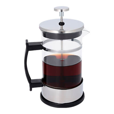Prensa francesa de vidrio con base de plástico, tapa y filtro de acero inoxidable. Medidas: 18.5 alto x 8.8 ancho