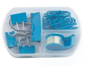 Set de papelería que incluye mini despachador de cinta adhesiva, 5 clips sujeta documentos y 20 clips para papel. Presentación: estuche de plástico transparente. Medidas: 9.2 x 6 x 2 cm