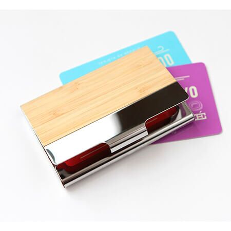 Porta tarjetas de metal con detalles en bambú y pestaña para cierre y apertura. Proporciona una solución práctica para organizar y proteger tus tarjetas, al tiempo que agrega estilo y sofisticación a tu día. Medidas: 6.5x9.6 cm.