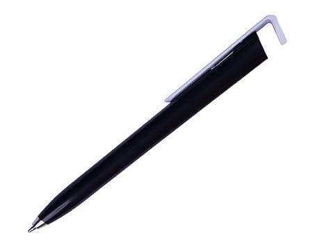 Bolígrafo de plástico a color con forma triangular. Clip en color blanco, diseñado para utilizarse como base para teléfono móvil. Mecanismo de click. Medidas: 14.5 x 1.5 cm
