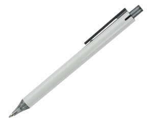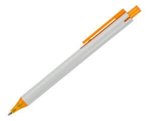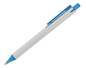 Bolígrafo de plástico, cuerpo blanco con botón y clip en color translúcido, refinada punta con terminación cónica. Mecanismo de click.