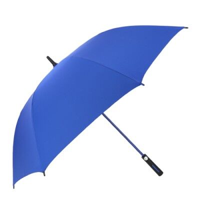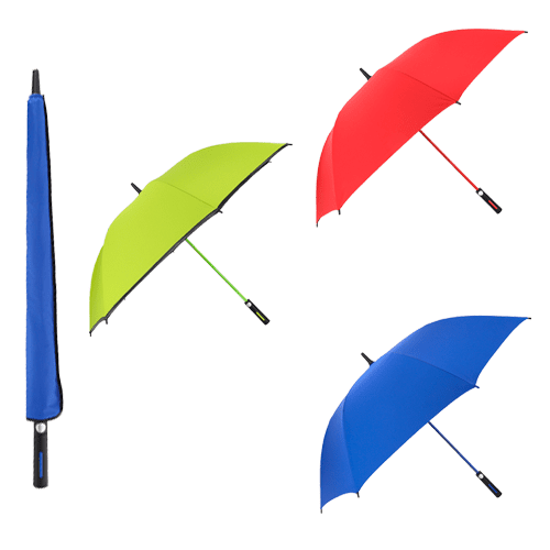 Paraguas de poliéster con punta de plástico, 8 gajos, varillas reforzadas, botón de sistema de apertura automático, mango con acabado rubber y cintilla de seguridad con velcro. Incluye funda. Medidas: 83 alto x 120 ancho