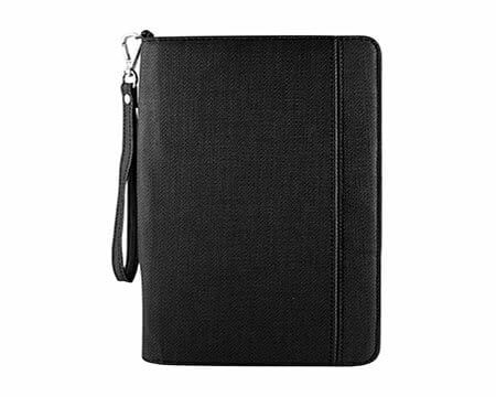 Compartimento para pasaporte, visa, boleto de avión y tarjeta de crédito. Batería auxiliar para smartphone, capacidad 4,000 mAh. Cable adaptador compatible con 8 pin y micro USB. Incluye correa. Medidas: 14 x 24 cm
