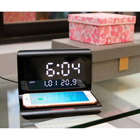 Reloj de escritorio o tocador, con cargador inalámbrico. Fabricado en plástico ABS. Carga a través de cable USB (incluido). Incluye caja de cartón individual. Mantén tu espacio despejado y ordenado sin cables. . Medidas: 17.2x11.5 cm.