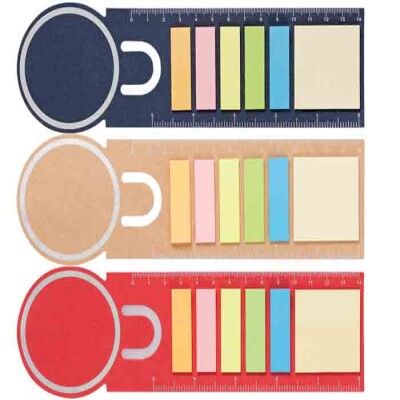 Separador de libros de cartón con regla impresa, extremo circular para impresión de logotipo. Contiene 5 líneas de banderas adhesivas y un block de notas cuadrado. Medidas: 6.1 x 21.5 cm