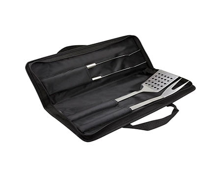 Maletín con cierre y asa. Incluye pinzas, tenedor y espátula. Medidas: 40 x 15 cm