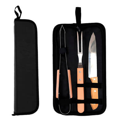 Set de BBQ. Incluye 1 pinza, 1 cuchillo, 1 tenedor trinchante y estuche de poliéster. Medidas: 8 alto x 38 ancho