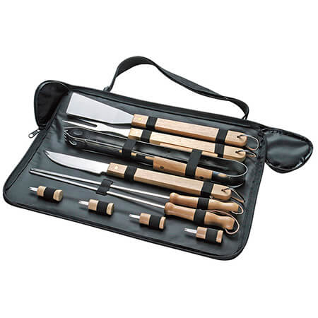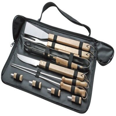 Ø 11,5 x 42,5 cm. Acero inoxidable y madera + Poliéster 210D. Set de 10 piezas: Espátula, tenedor parrillero con mango, pinza, cuchilla, 2 pinchos para brocheta y 4 pinchos pequeños. Estuche con cierre y correa regulable. .