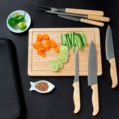 Set de BBQ fabricado en acero inoxidable y mangos de roble, incluye 7 piezas (cuchillo de chef, cuchillo pequeño, cuchillo deshuesador, cuchillo para carne, tenedor, afilador y tabla para cortar). Medidas: 24.5x37 cm.