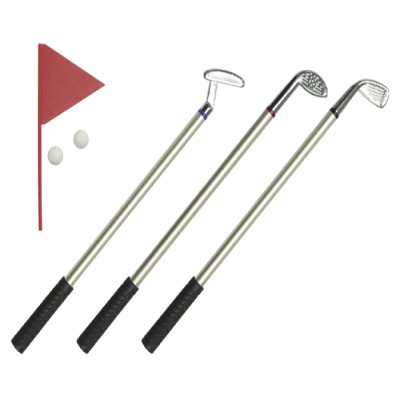 Exclusivo juego de escritorio para los amantes del golf, consiste en set de 3 bolígrafos metálicos, de tinta Negra, Azul y Roja, con forma de los distintos tipos de palos de golf, dos mini pelotas de golf y el interior del estuche funge como campo de golf. Presentación: Caja negra. Medidas: Bolígrafos 21.5 x 3.5 cm // Estuche: 24.3 x 10.4 x 3.5 cm