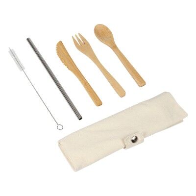 Set de cubiertos reutilizables fabricados en bambú, con funda de tela de algodón que cuenta con broche de seguridad. Incluye cuchara, cuchillo, tenedor, popote de acero inoxidable y cepillo limpiador. Son ideales para viajar y responsables con el medio ambiente. Medidas: 22.4x20 cm.