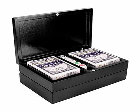 Incluye estuche de madera con 5 dados, 2 barajas plastificadas y dominó de 28 piezas. Medidas: 19.5 x 12 cm