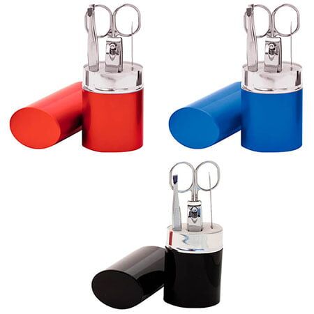 Set de manicura en estuche ovalado de metal, con 4 piezas (cortaúñas, lima de metal, pinzas para cutículas y tijeras). . Medidas: 11.5x4.5 cm.