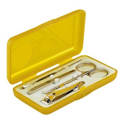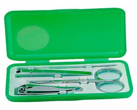 Set con 1 tijeras, 1 pinza para cejas, 1 corta uñas y 1 retira cutícula. No para uso profesional. Medidas: 10 x 5.3 cm