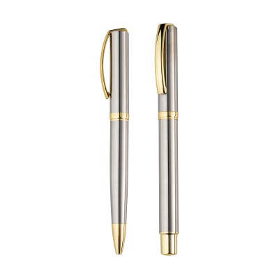Set de ball y roller pen fabricadas en latón, con detalles dorados en clip y punta, tinta de escritura azul. Incluye caja de cartón individual. Medidas: 14x1.2 cm.