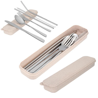 Set de cubiertos con estuche de wheat straw (fibra de trigo) que incluye: cuchara, tenedor, cuchillo, 2 popotes y cepillo, todos de acero inoxidable. Medidas: 6.2 alto x 25 ancho