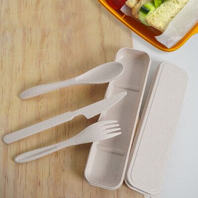 Set de cubiertos de wheat straw (fibra de trigo). Incluye cuchara, tenedor y cuchillo. Medidas: 21.5 alto x 5.3 ancho
