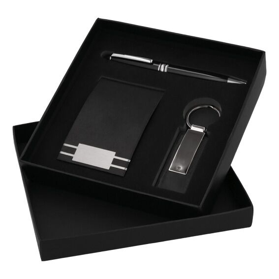 Set ejecutivo: Incluye llavero metálico y curpiel, tarjetero, bolígrafo metálico y estuche de regalo. Medidas: 17 alto x 16.5 ancho