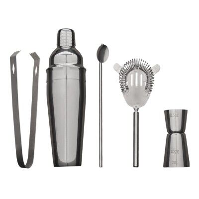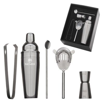 Set para coctelería de acero inoxidable, incluye: shaker de 550 ml, shot medidor, pinzas para hielo, cuchara con popote y un colador con mezclador. Presentación: caja en color negro. Medidas: 26 x 29 x 9 cm