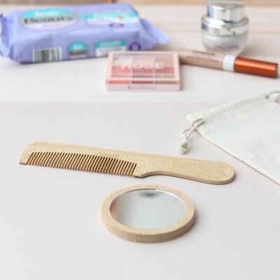 Set de belleza con espejo y peine fabricado en bambú. Incluye bolsa de tela con jareta para transportar a todos lados. Es ideal para viajes o para llevarlo en la bolsa. Medidas: 11,5x8,5x3 cm.
