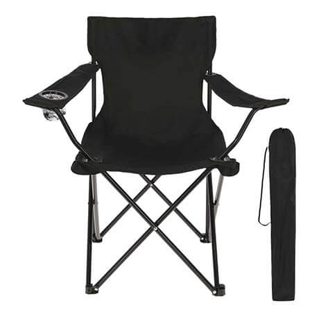 Silla plegable de fácil armado con reposabrazos, porta vasos de malla y funda con jareta y correa. Medidas: 80 x 80 x 43 cm