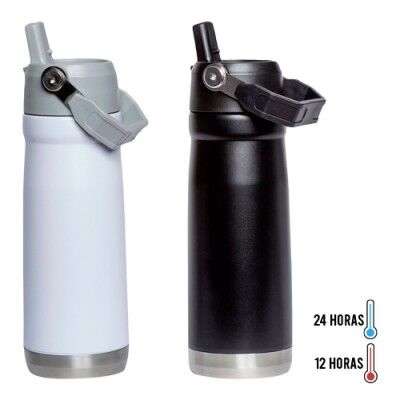 Termo de acero inoxidable, insulado al vacío, su tapa enroscable cuenta con boquilla abatible, popote y asa en la parte superior. Medidas: 23.1 alto x 7.3 ancho