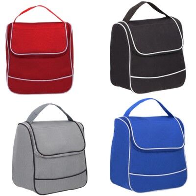 Lonchera de poliéster con interior impermeable plastificado, cierre, asa y un compartimento externo al frente. Medidas: 24 alto x 23 ancho