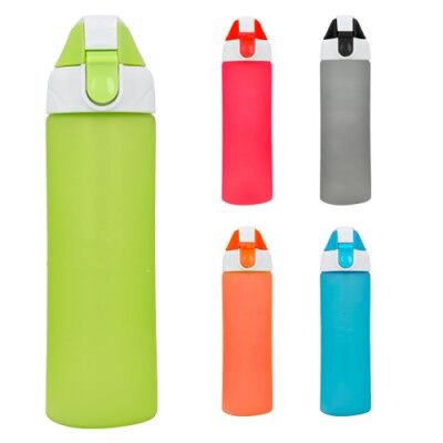 Cilindro de plástico rubber, con colador, tapa de seguridad y cinta de poliéster para una mejor sujeción. Medidas: 24 alto x 7 ancho