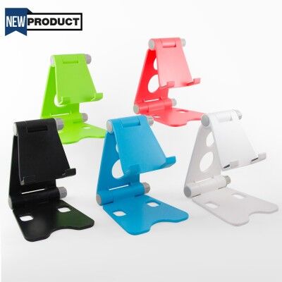 Soporte de escritorio para dispositivos móviles. Cuenta con base antiderrapante y perillas para ajustar el ángulo de visión deseado. Mecanismo plegable para una práctica transportación.