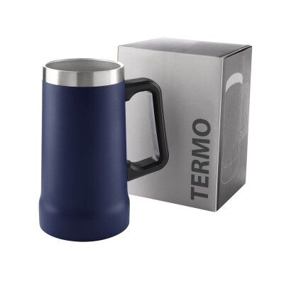 Tarro para bebidas frías o calientes. Aislamiento al vacío. Acero inoxidable de doble pared. Terminado rugoso. Incluye asa amplia de plástico y caja individual. Medidas: 8.3 x 9.8 x 17.2 cm