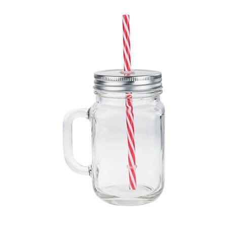 Tarro de vidrio con asa y tapa metálica. Incluye popote rígido. Medidas: 13.5 alto x 7.5 ancho