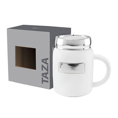 Taza tarro de cerámica con placa metálica para impresión. Tapa de rosca de plástico con recubrimiento metalizado. Terminado mate. Incluye caja individual. Medidas: 7.5 x 12 cm