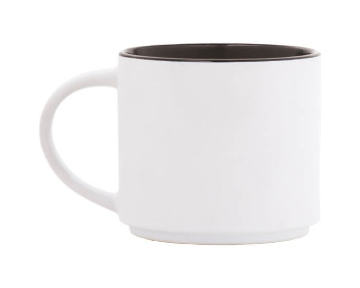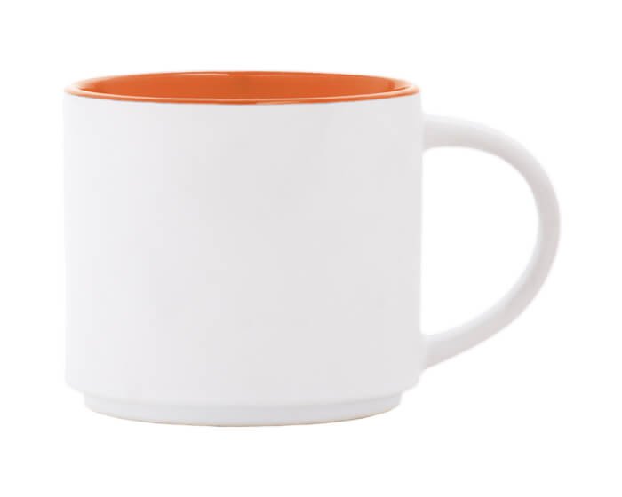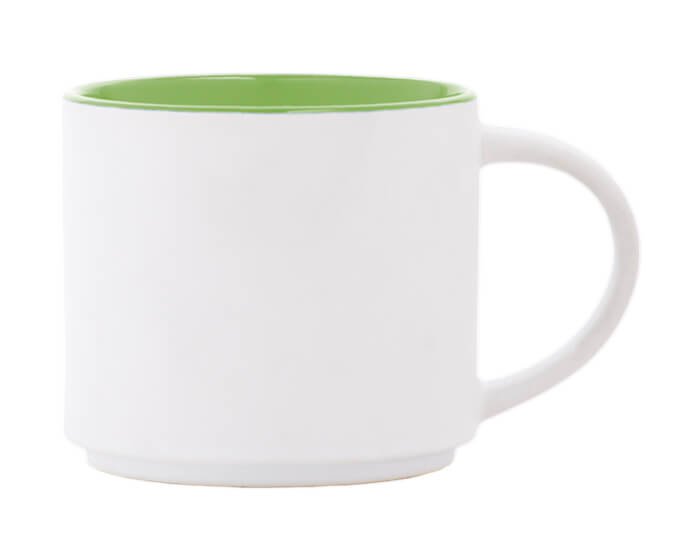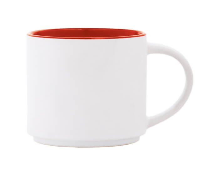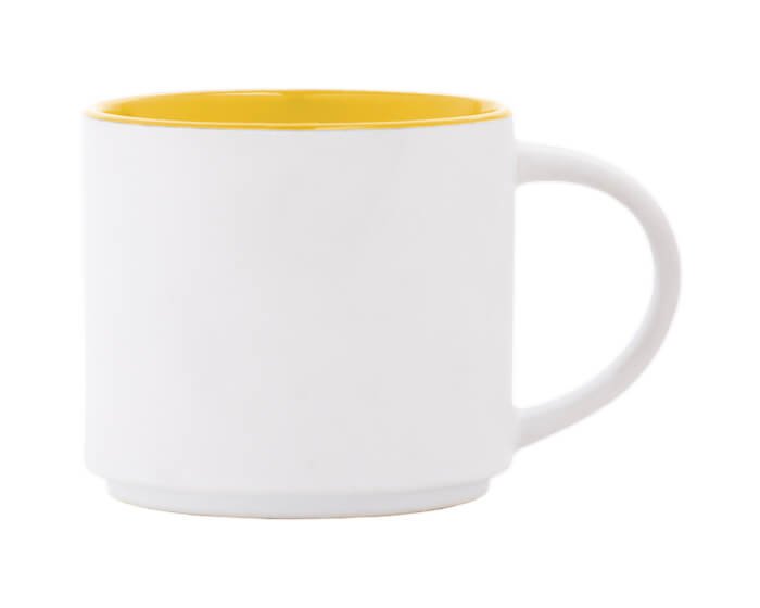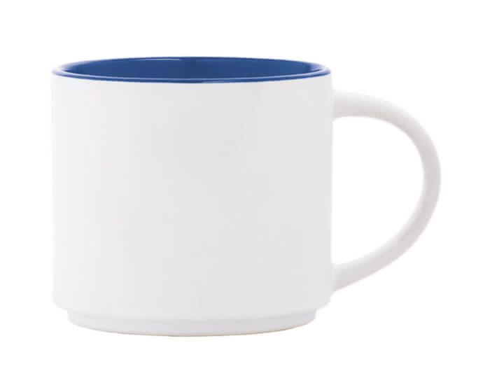 Taza de cerámica bicolor con exterior blanco mate e interior en color brillante. Se puede acomodar de forma vertical. CAP. 15 OZ. Venta en múltiplos de 12. Medidas: Ø 10 x 8.9 cm