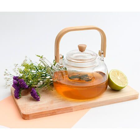 Tetera de vidrio de borosilicato con asa y detalle en tapa de bambú. Capacidad de 900 ml. Incluye caja de cartón individual. Apto para estufa, esta tetera se puede colocar directamente en estufas de gas o eléctricas. Medidas: 16.5x17.2 cm.