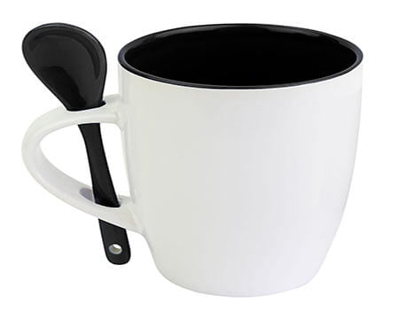 Taza de cerámica exterior blanco e interior de color. Incluye cuchara. Venta caja cerrada de 36 piezas. Medidas: 8.3 x 10.3 cm