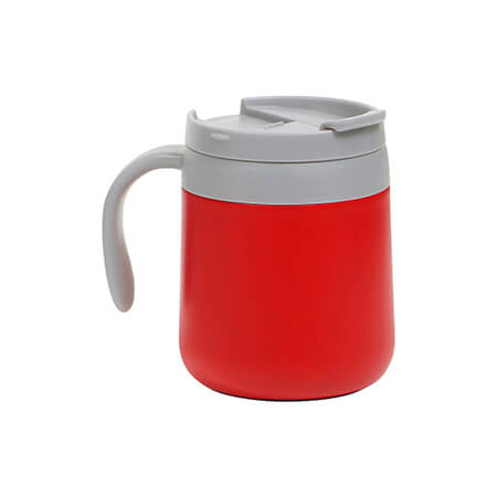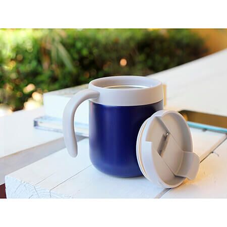 Taza térmica de en acero inoxidable doble pared, con asa y tapa de polipropileno (PP). Fabricado en materiales de grado alimenticio, mantiene bebidas frías o calientes por un largo tiempo, no usar en microondas, capacidad 390 ml. Incluye caja de cartón individual. Medidas: 11.5x8.5 cm.