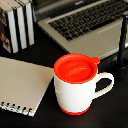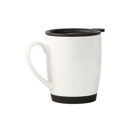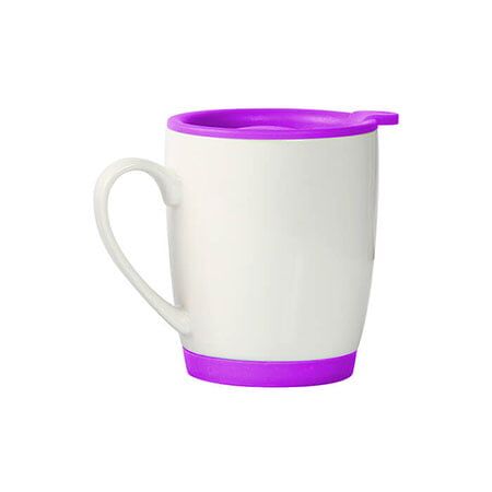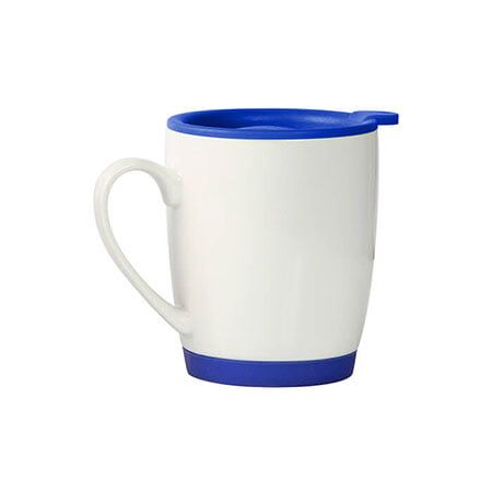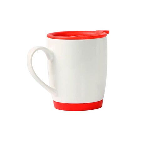 Taza de cerámica blanca con tapa y base tipo Ruber en color, capacidad de 300 ml. Medidas: 10.5x8.7 cm.