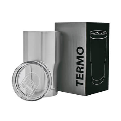 Doble pared. Cerrado al vacío. Pared interna y externa acero inoxidable. Tapa de plástico con válvula de seguridad. Base metálica en color plata. Mantiene temperatura caliente 6 hrs y temperatura fría 8 hrs aproximadamente. Incluye caja individual. Medidas: 8 x 14 cm