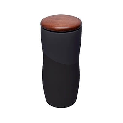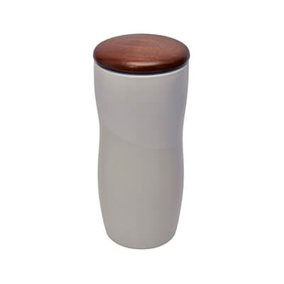Doble pared de cerámica con tapa de madera. Reduce la transferencia de calor de las bebidas al exterior evitando quemarse los dedos. Incluye caja individual. Medidas: 8 x 18 cm