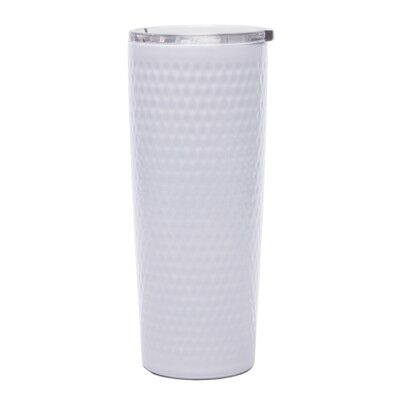 Vaso térmico de doble pared de acero inoxidable insulado al alto vacío, tiene una sutil textura de pelota de golf que le da gran personalidad; conserva las bebidas calientes por 10 horas y frías por 20 horas. Cuenta con tapa a presión transparente con seguro deslizable, para poder beber fácilmente. CAP. 20 Oz. (590 ml.). Presentación: caja en color blanco. Medidas: Ø 9.3 x 18 cm