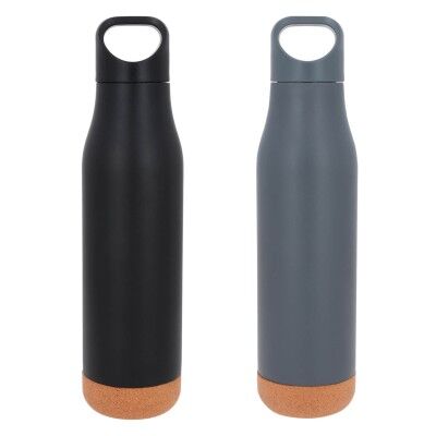 Termo con doble pared de acero inoxidable, insulado al vacío, acabado rugoso, base de corcho, y tapa enroscable con asa. Cap. 500 ml. Medidas: 27.7 alto x 6.7 ancho