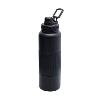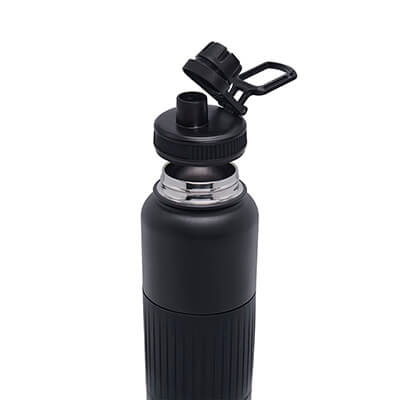 Doble pared. Cerrado al vacío. Pared interna y externa acero inoxidable. Cuenta con manga de silicón. Terminado tipo rugoso. Tapa de plástico con doble boquilla y asa. Mantiene temperatura caliente 6 hrs y temperatura fría 8 hrs aproximadamente. Incluye caja individual. Medidas: 9 x 30 cm